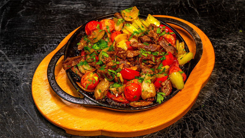 250 Gr dana kuşbaşı, yeşil ve kırmızı biber, arpacık soğan, domates, süzme yoğurt, pilav ve salata ile servis edilmektedir.